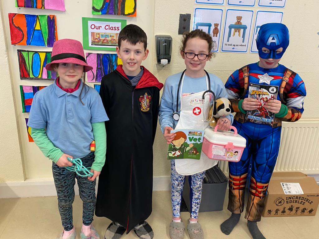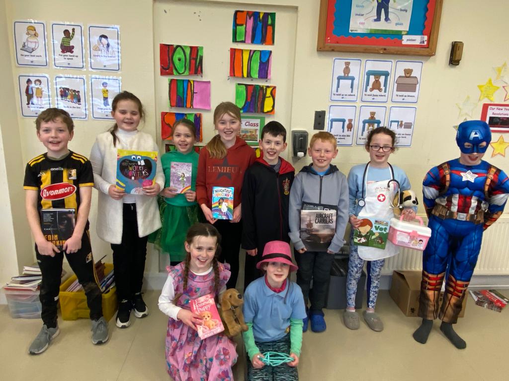 Photographs from 2nd to 4th class where the children dressed up as their favourite character from a book for World Book Day 2022.